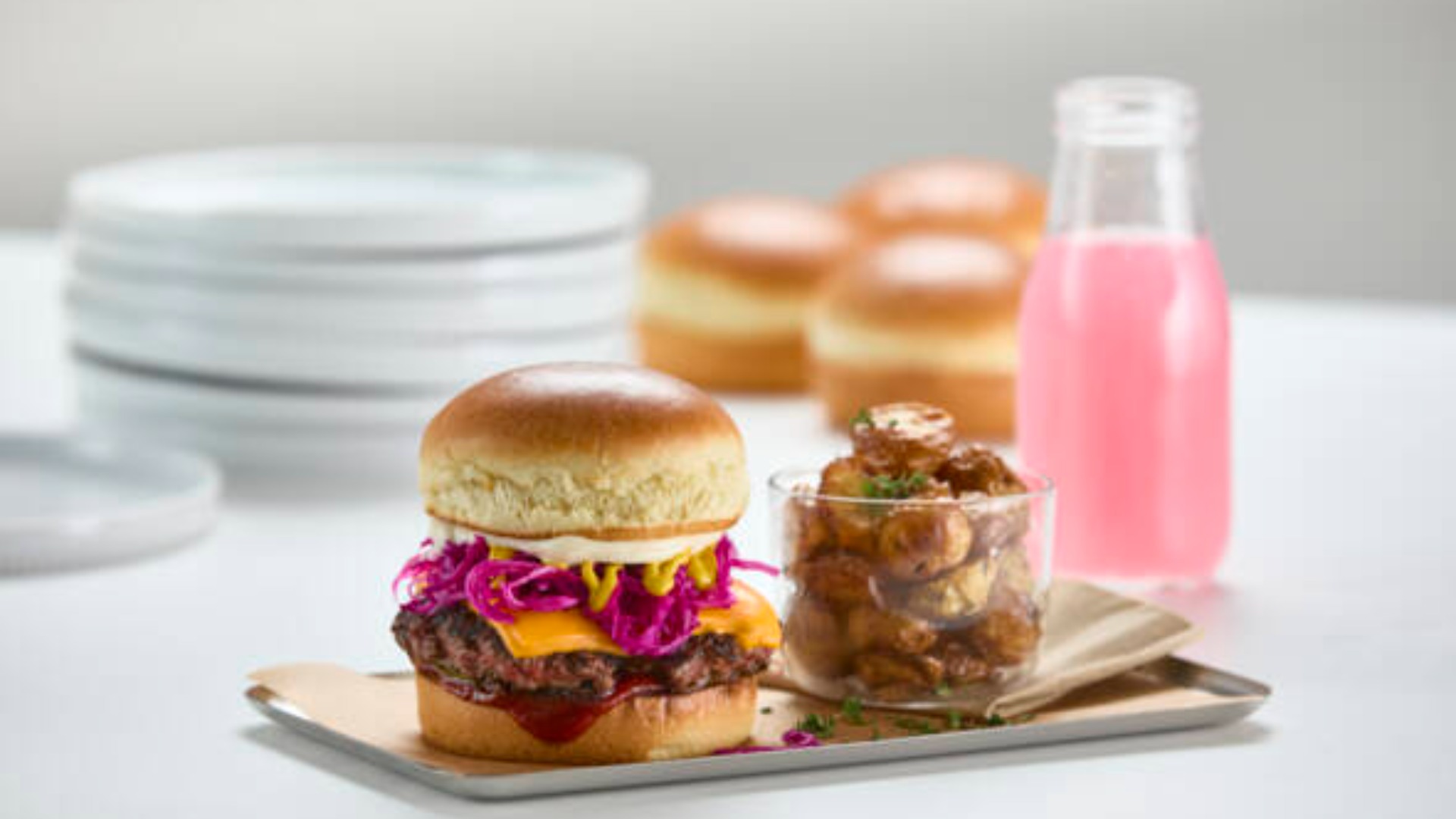 Brioche Style Tall Bun bliver serveret med crispy kylling, salat, syltede rødløg og røget mayonnaise.