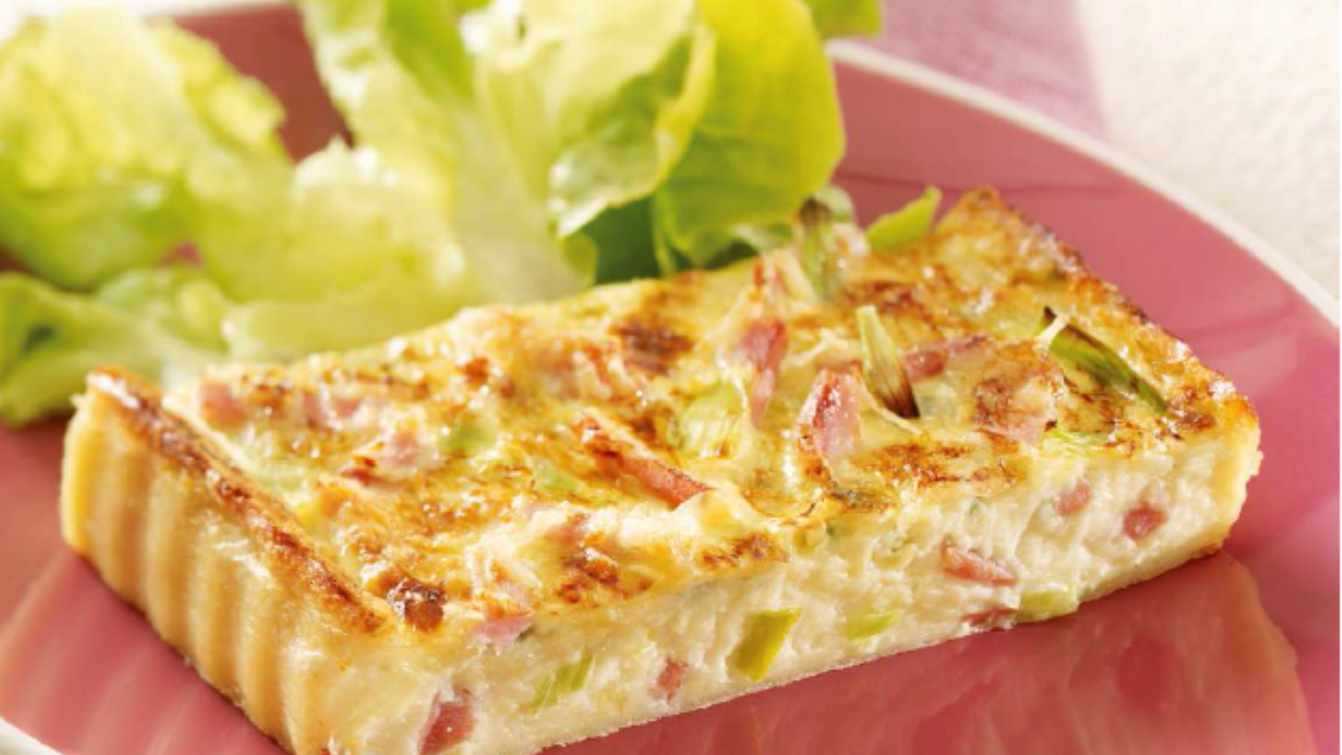 Lækker tærtestang med bacon (Quiche Lorraine) med mørdejsbund bagt med smør. Udskæres i passende stykker efter behov.