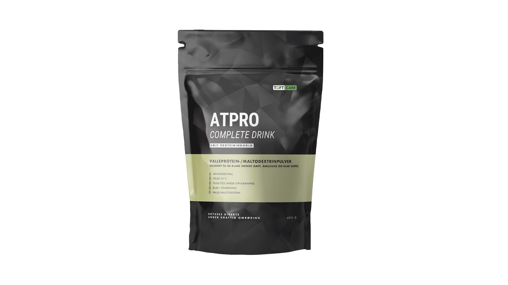 Atpro Complete Drink protein- og kulhydratpulver anvendes til protein- og energiberigelse af mad og drikkevarer til småtspisende. Atpro Complete Drink kan anvendes i et utal af drikkevarer, hvorved protein- og energiindholdet optimeres. Atpro Complete kan anvendes direkte fra emballagen og er næsten glasklar ved opblanding. Med Atpro Complete beriger du dine mad- og drikkevarer, så de stadig er indbydende og genkendelige.