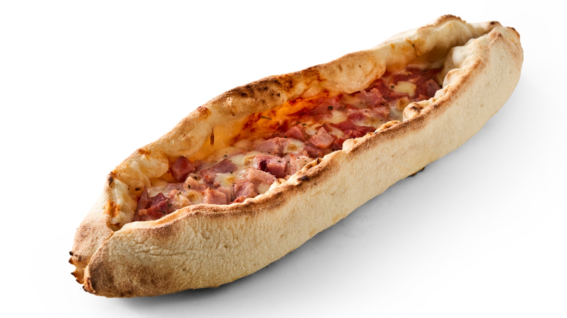 En Barchetta med lækkert fyld af skinke og mozzarellaost. Ordet barchetta der betyder ”lille båd” beskriver serveringsstilen på denne pizzasnack. Barchettaen har høje og luftige sider og en mere koncentreret smag midt på. Sprød og lækker til at tage med på farten eller nyde sammen med en god salat.