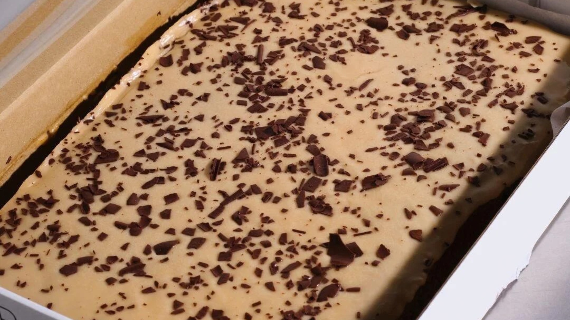 Blød karamelkage med karameltopping og mørke chokoladeflager.