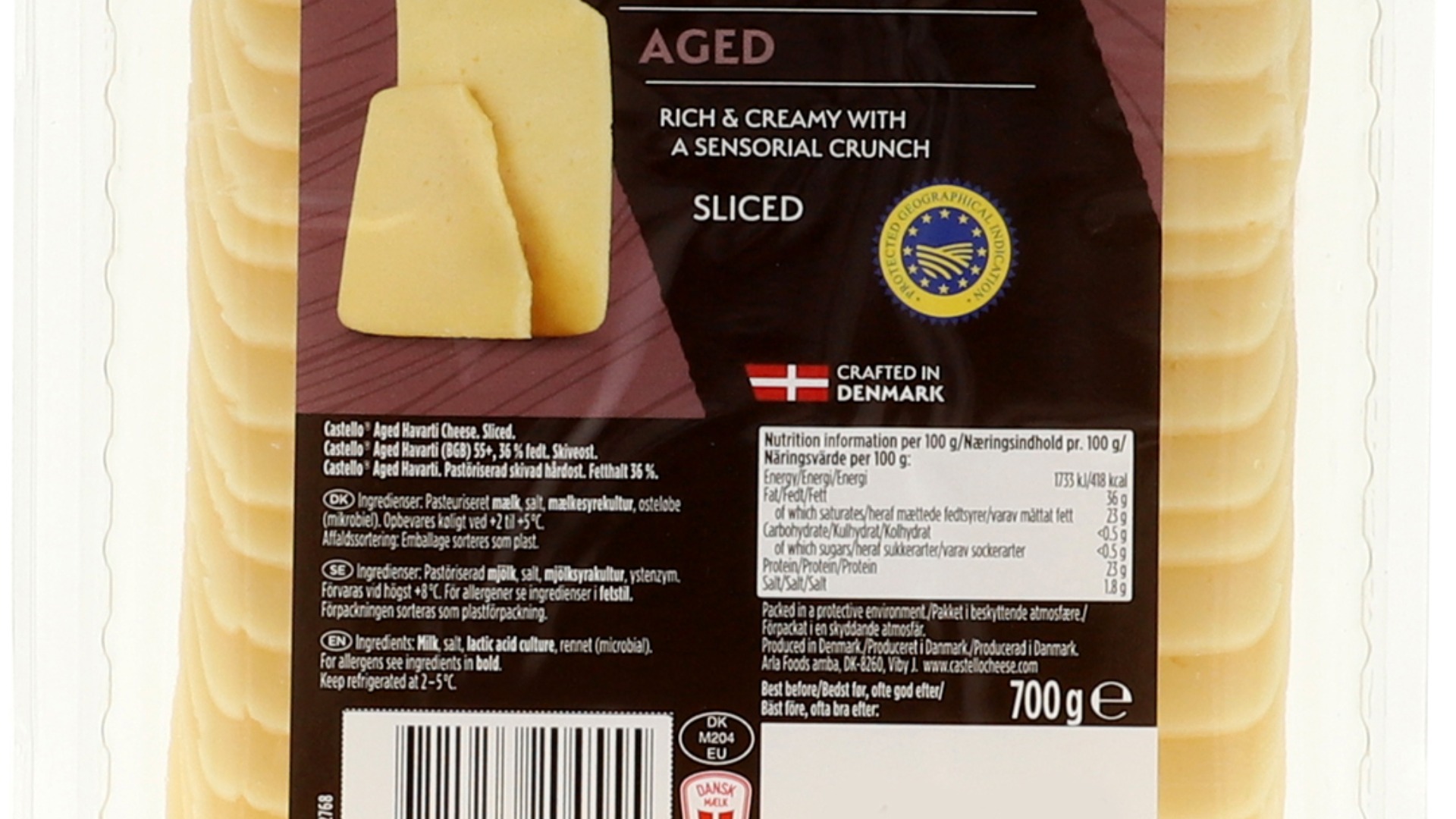 Castello Aged Havartiost er lavet efter traditionel opskrift fra 1952. Der sker noget fantastisk, når man lagrer den milde, og let skarpe, danske Havarti. Som osten modnes, bliver konsistensen lidt fastere og let smuldrende end yngre Havarti oste. De forskellige smage samler sig, og man oplever et skønt knas af krystaller på tungen, og en dristig og unik smag. Denne ost har den officielt EU´s beskyttet geografiske betegnelse BGB-mærke og kan kun produceres i Danmark under strengt kontrollerede produktionsmetoder. – 700g skønt knasende havarti specialost i skiver med BGB-mærke – Lagret, typisk modnet i 11 måneder – Smøragtig med noter af karamel – Strejf af karamelliserede løg – Velegnet til tapas og ostebord – Kreativt skabt i Danmark – Egnet for vegetarer