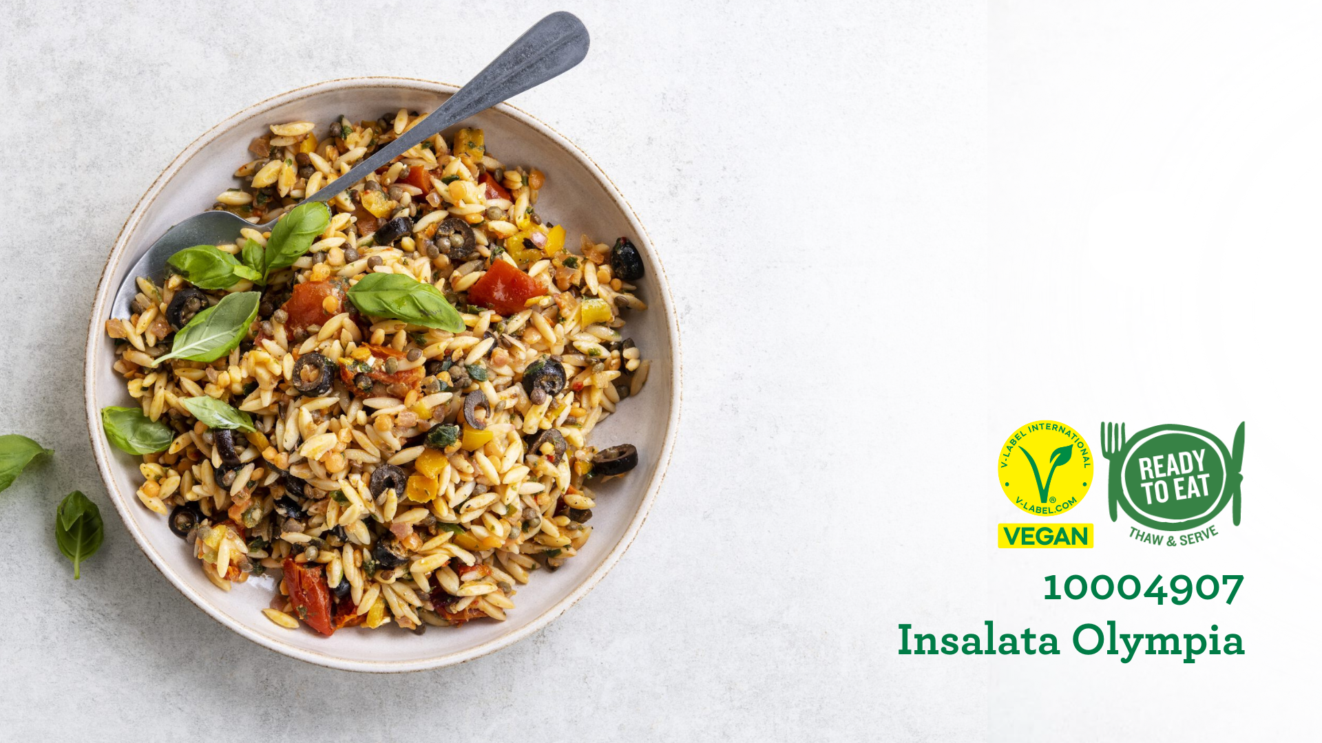 Ardo Insalata Olympia er en ready to eat salat med en blanding af risoni, marinerede soltørrede tomater, orange og grønne linser, sorte oliven, rødløg, grillede gule peberfrugter og ramsløg. Den salte smag af linserne er afbalanceret med smag af ramsløg, grillede peberfrugter og en søde sennepsdressing.
