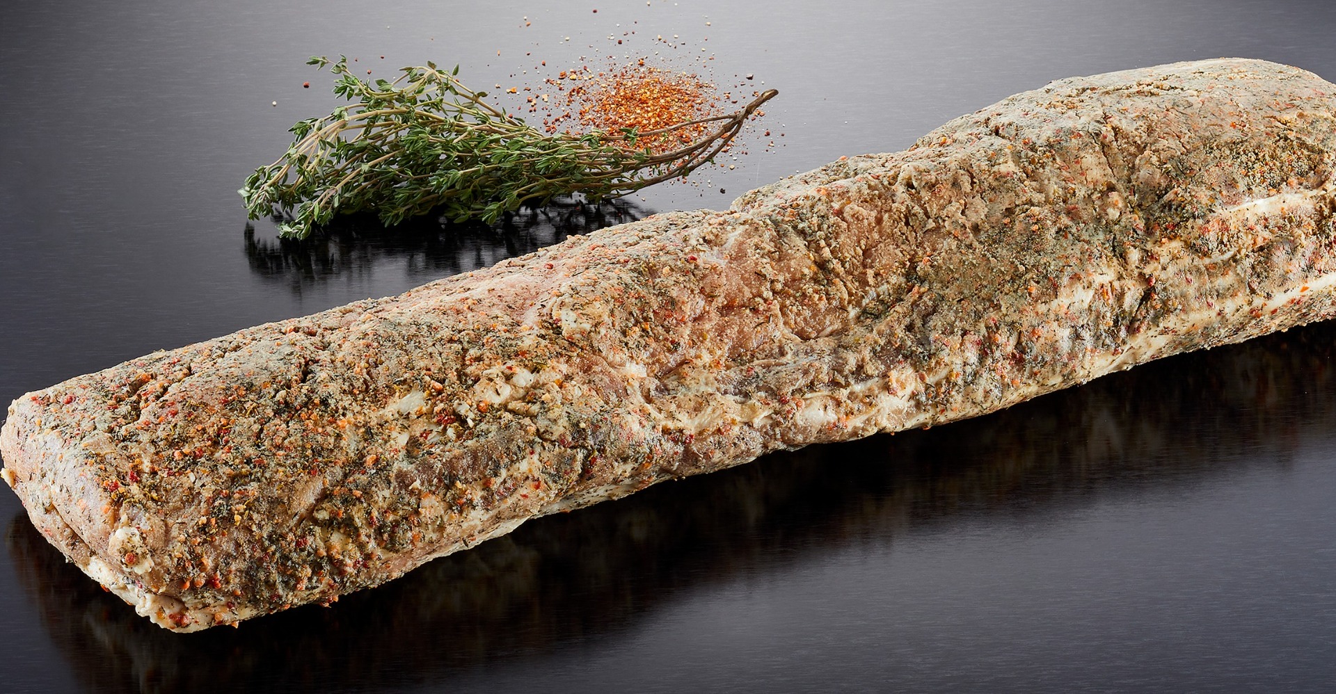 Dansk kamfilet af gris tilsat smagsneutral lage, der giver en ensartet spisekvalitet og bevarer saften i kødet, så hele stykket kan anvendes, også når det varmholdes eller genopvarmes. Marineret i citronskaller, gulerødder og krydderier som timian og rosmarin, der gør kødet oplagt som f.eks. helsteg på buffetbordet.