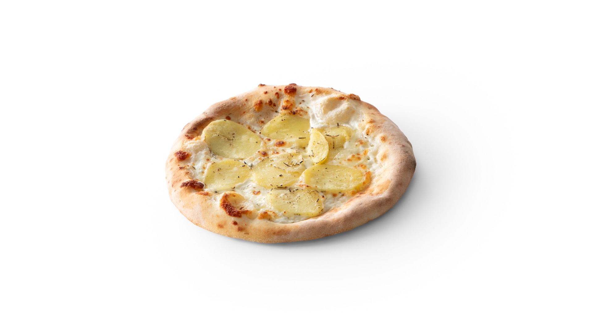 En lys og indbydende pizza – også kendt som en hvid pizza – med en tynd og sprød bund bagt på durummel. Bundene er håndslyngede, hvilket giver et autentisk præg og indbydende look. Pizzaen er toppet med en hvid sauce af cremet fløde, tynde skiver kartoffel, mozzarella og rosmarin. Pizzaerne er forbagte og kræver kun kort færdigbagning før servering. Tip: Tilføj en smule god olivenolie og et strejf af havsalt før servering for at fuldende smagen.