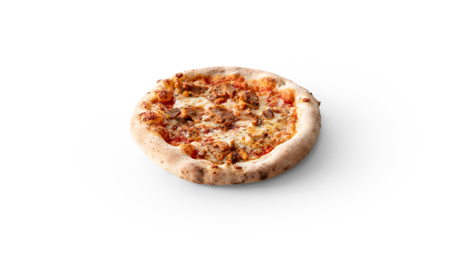 En italiensk-inspireret pizza på en tynd og sprød bund bagt med durummel. Bundene er håndslyngede, hvilket giver et autentisk præg og et indbydende udtryk. Pizzaen er toppet med tomatsauce, krydret kyllingekebab, mozzarella og oregano. Pizzaerne er forbagte og kræver kun kort færdigbagning før servering. Tip: Fold pizzaen og fyld den med frisk salat og cremefraiche-dressing og server den som en pizzasandwich."