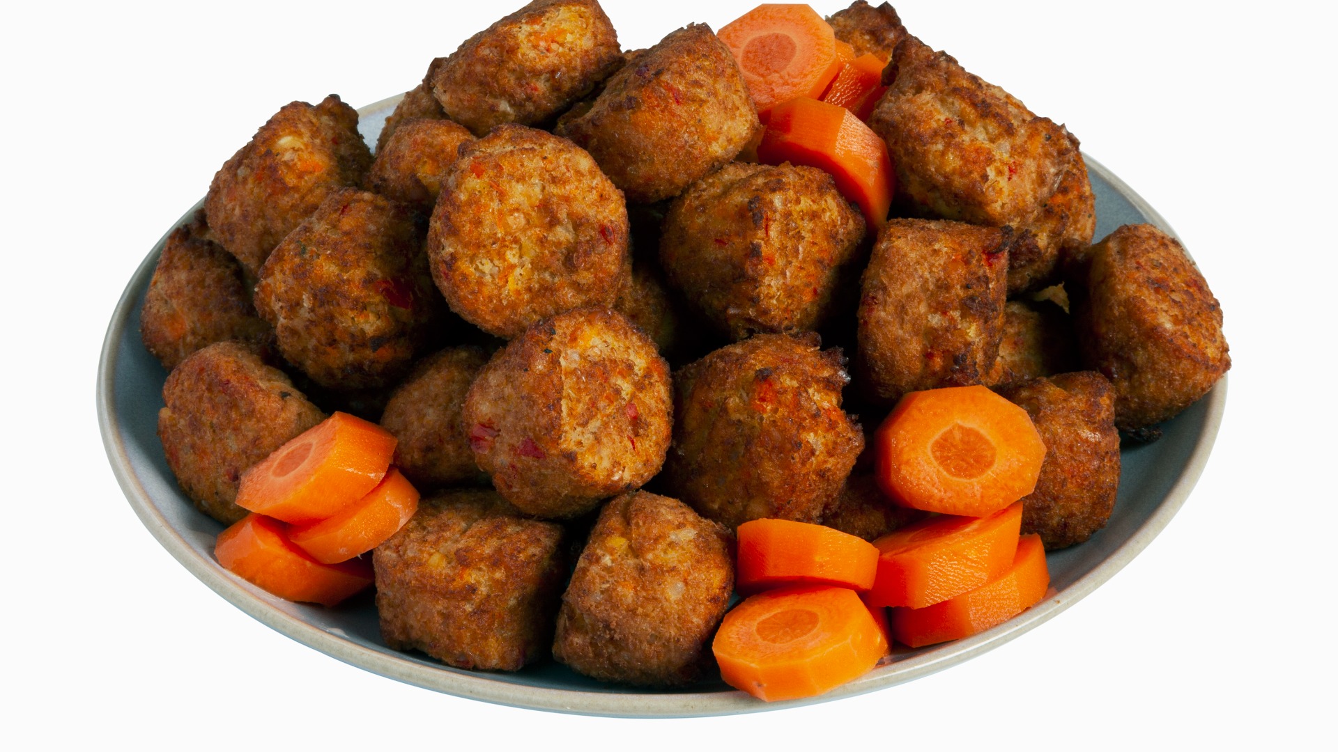 Et lækkert mix af søde gulerødder, Ingrid ærter, linser, bløde kartofler og let syrlig peberfrugt – formet i små, saftige kugler/bites med quinoa. Mildt krydret og 100% plantebaseret. Perfekt til børn og voksne. Intet spild – tag hvad du skal bruge fra frost. Kan serveres både kolde og varme.